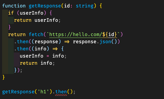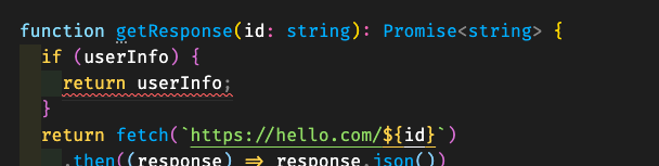 - getResponse 함수는 프로미스 객체를 뱉는 함수이길 기대한다. 내용을 보면 이미 유저 정보가 있는 경우 캐시로써 바로 결과를 뱉게되는데, 이것이 타입이 맞지 않아 then을 호출할 수 없는 것이다. 즉 실제로 개발자의 실수는 함수내의 If문을 잘못 작성한 것이다.