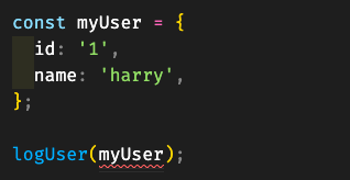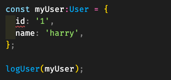 - 그러나 실제 문제가 되는 부분은 어디일까. 바로 개발자의 실수로 myUser을 잘못 작성한 부분일 것이다. 만약 객체 리터럴을 정의할 때 타입을 명시했다면 속성 체크가 동작하여 아래와 같이 실제 문제가 되는 부분을 사전에 찾아낼 수 있었을 것이다.